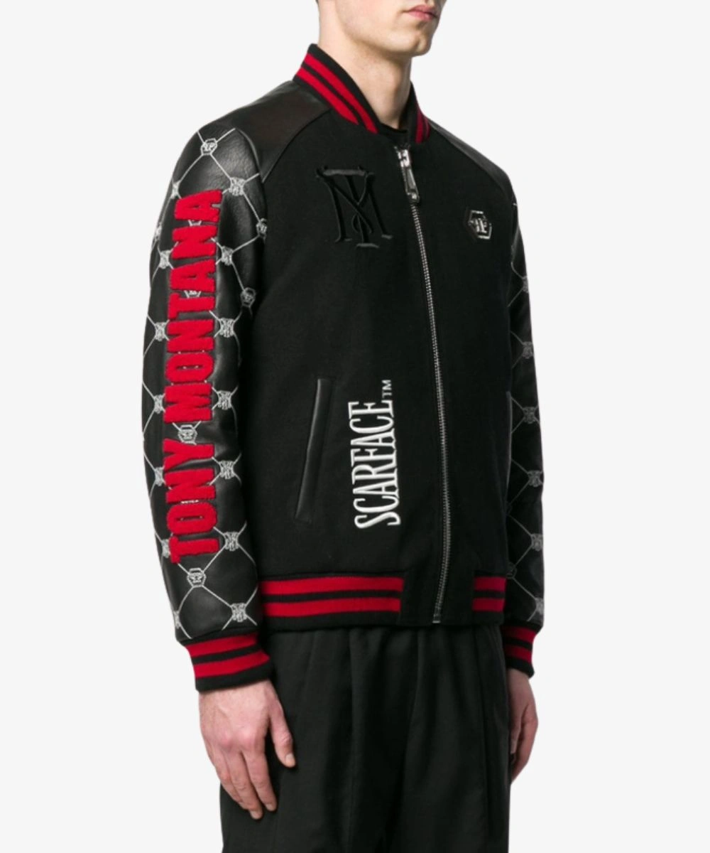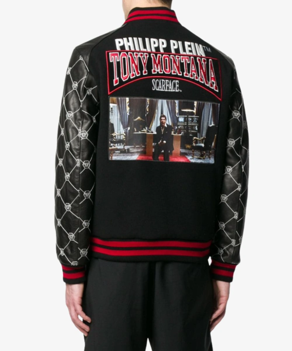 It has an inner lining that locks in warmth for the night out or stepping into cooler days. Shop Unisex Philipp Plein Tony Montana Leather Bomber Scarface Jacket – Black And Red to add a touch of edgy luxury. It features a sleek bomber design with a striped rib knitted collar, cuffs and hemline. The vibrant texture creates a bold contrast against the dark body and provides a comfortable fit.Â