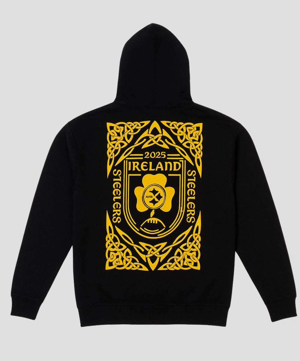 Wear the Irish spirit and Steelers legacy proudly with the Pittsburgh Steelers Ireland Hoodie. It is a fresh take to show your Steelers pride with a creative twist. This hoodie is stitched with a quality fleece with a black backdrop and gold graphic details for a premium look. The design includes a sleek pullover that feels against the skin and allows movement while keeping your neck warm. Ideal for city strolls and game day look, this Pittsburgh Steelers Mitchell & Ness Ireland Pullover Hoodie – Black is a year-round staple. Its relaxed fit makes it easy to wear and gives your outfit a fresh and eye catching edge.Â
