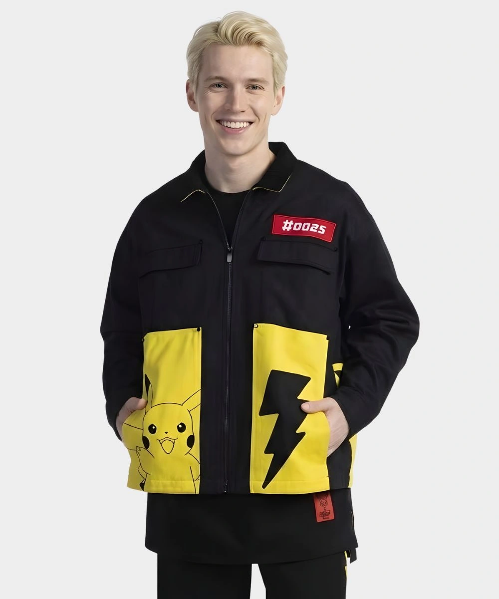A classic shirt style collar and a smooth gliding zipper closure define the front, providing a streamlined look. It features intricate embroidery and playful patches that decorate the chest and back, and showcases JimmyPaul’s creative streetwear style. This piece turns a classic silhouette into a colorful tribute to everyone’s favorite electric type Pokémon. The button cuffs allow for a custom fit at the wrists, while the soft fabric and quality bridges the gap between playful fan gear and high-end street style. The design is equipped with a four-pocket system for functional storage. It has two spacious waist pockets and two secure chest pockets for keeping essentials close.