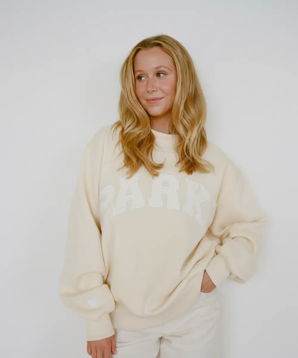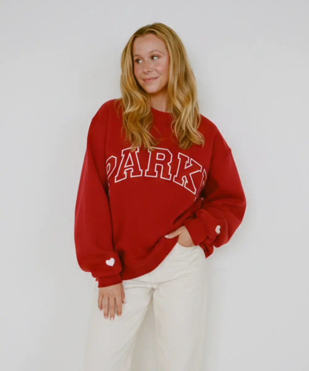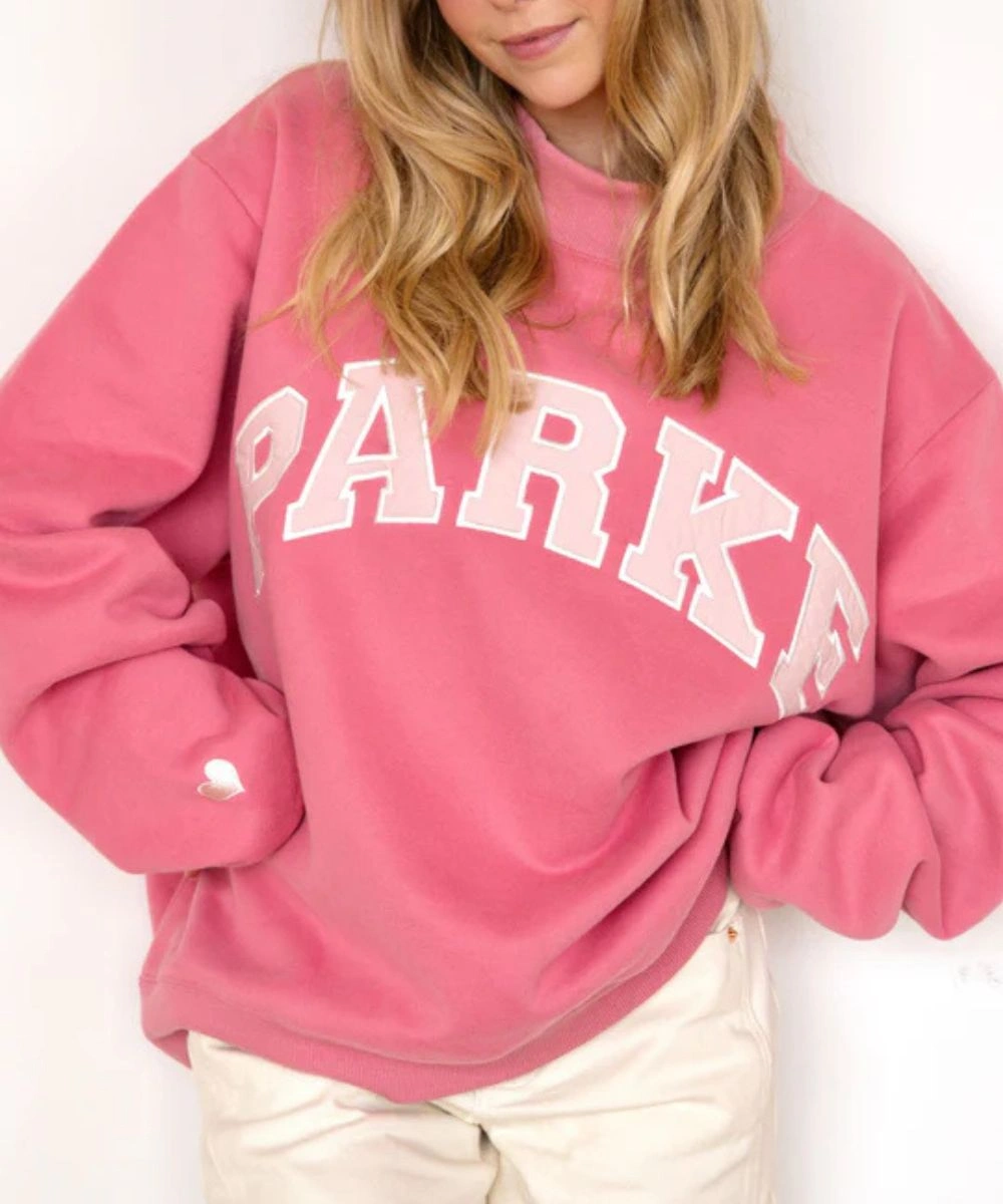 It has a ribbed crew neckline for a neat look and classic finish. The front showcases a bold Parke graphic text that adds an iconic detail. The shoulders have a slightly dropped look. Ribbed cuffs and hemlines add sturdy structure and ensure you stay comfortable throughout. Subtle heart motifs around the cuff add signature details and enhance the style. This sweatshirt, Preorder Pink Aid x Parke blends comfort and casual chic for hassle-free wear and style. It feels like a cosy hug, all while looking clean and stylish.