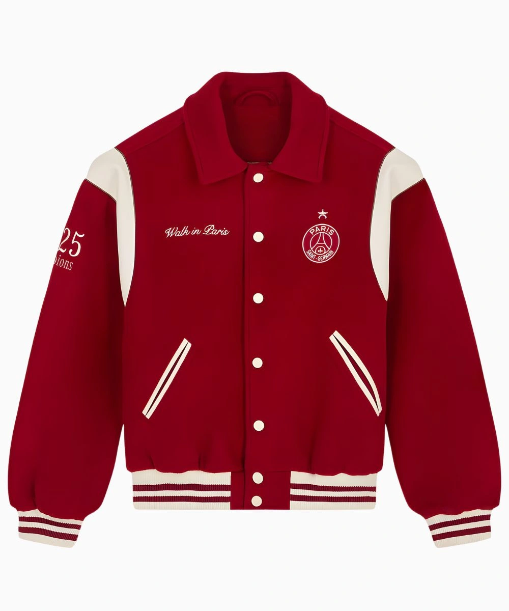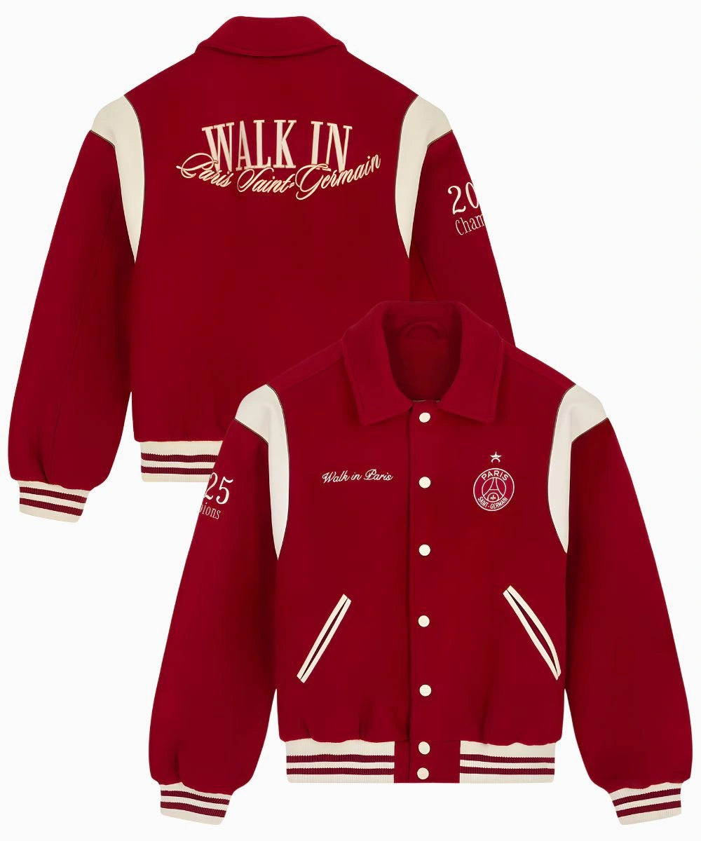 Unlock the ultimate mix of Parisian haute couture and elite football in this PSG x Walk in Paris Teddy Jacket. It includes vintage style and contemporary streetwear inspirations to provide a fresh take on the classic letterman design.