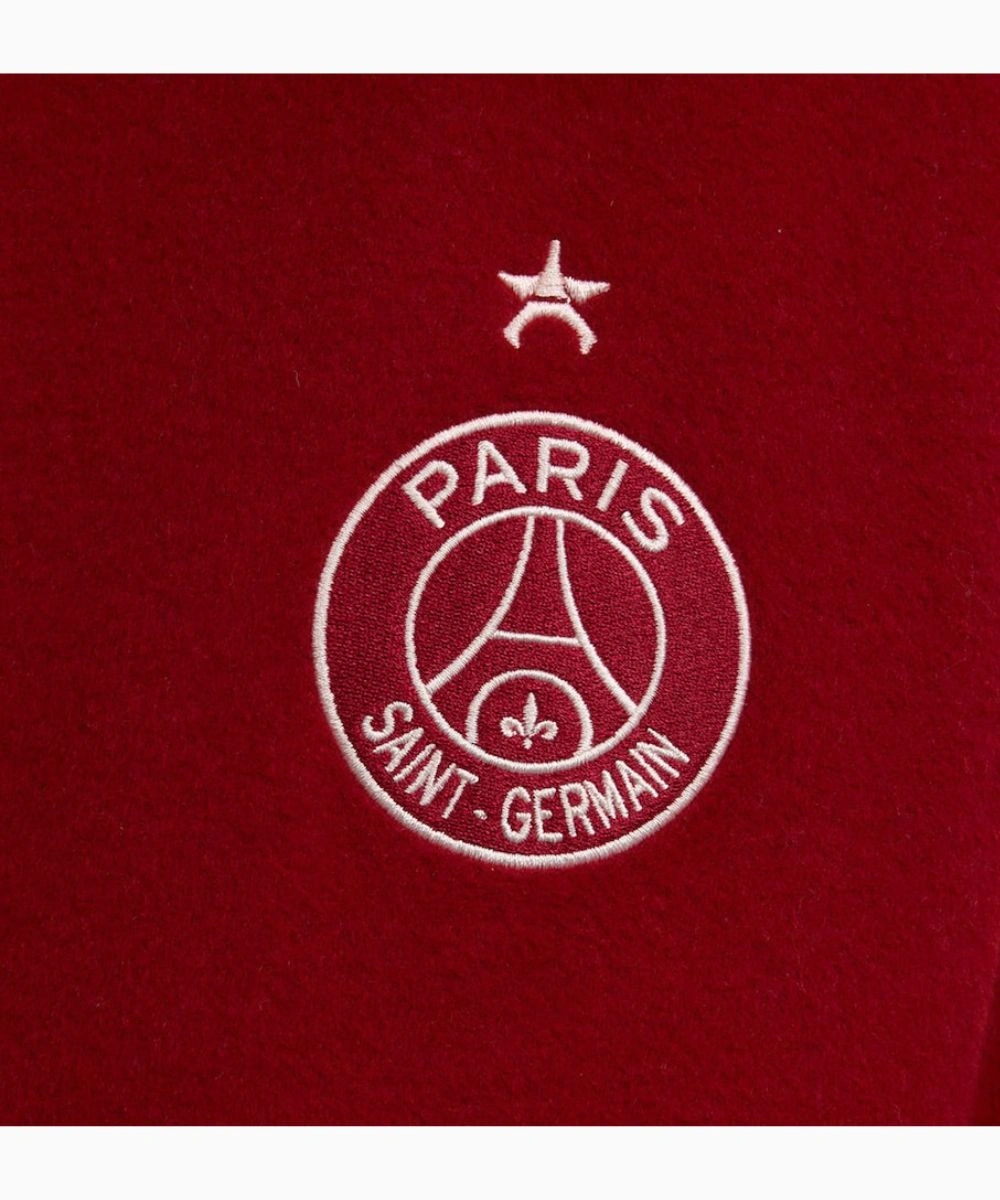 Constructed of luxurious wool fabric that delivers refined style, reliable warmth and long-term wear. The design is defined by its prominent maroon and cream colourway, featuring detailed embroidery and patches across. It creates a bold, rhythmic visual across the body and honours the prestige of Paris Saint-Germain.