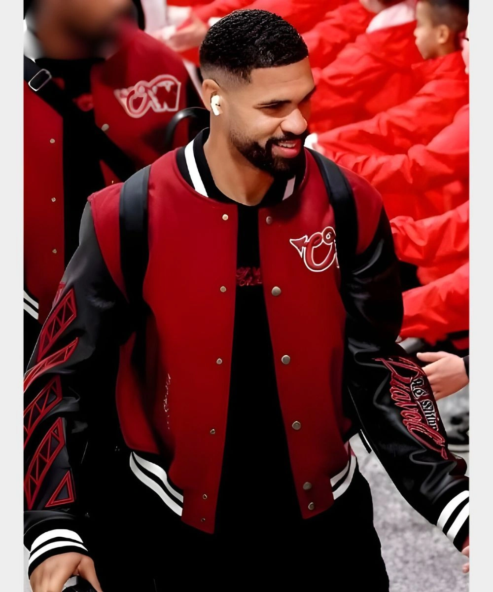 Wear iconic football heritage with a luxury streetwear twist in this Off-White Cheek Varsity Jacket. This garment is designed with a maroon and black colour scheme that reflects quality athletic history. The wool and leather construction creates a durable and toasty silhouette. It is distinguished by its fun yet bold graphic detail and skillfully embroidered patches that tell a unique story. The high-grade leather gives a durable finish, and rib knit cuffs add a snug shape to it. It is densely woven and has a premium feel.Â