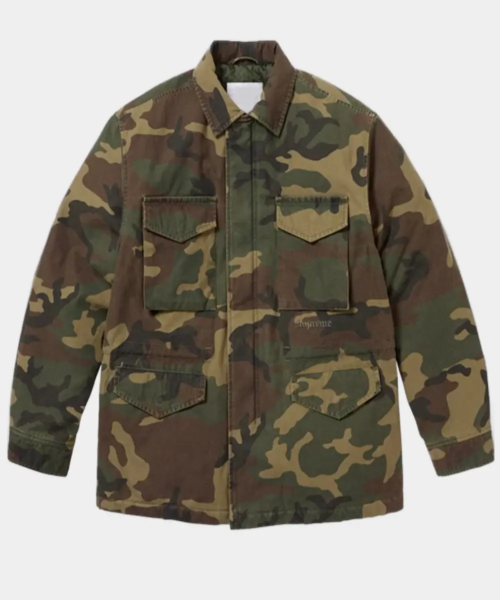 Shop Fall-Winter 2025 AOI Cross Supreme M52 Jacket In Woodland Camo and Black (FW25) for rugged durability in a functional outerwear. An eye-catching statement piece that sets a bold new fashion standard. Multiple pockets include two small flap chest pockets with a subtle “Supreme” logo and two wide flap pockets at the waist.