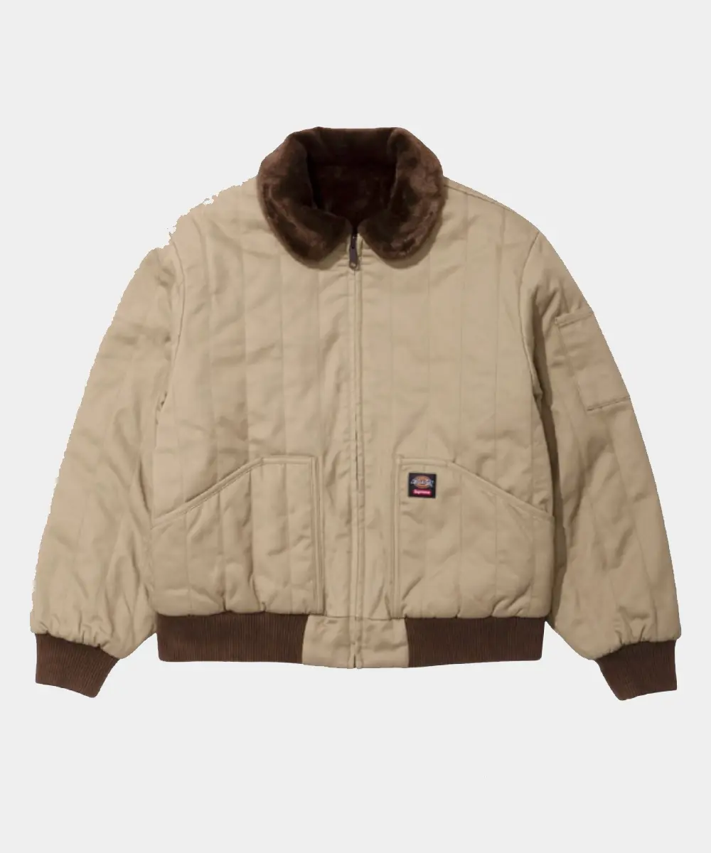 This Supreme x Dickies Reversible Quilted Faux Fur Work Jacket is your upgrade from rugged workwear to street-ready style. Built with woven fabric and faux fur lining for added warmth and durability. Its versatile design stands out in both fashion and functionality. Its two reversible sides offer distinctive looks and present a sleek, utilitarian aesthetic. Supreme x Dickies Reversible Faux Fur Work Bomber Jacket – Fall-Winter 2025 is available in two beautiful shades, brown and black. It features a turn-down collar and full zip closure to ensure ease of wear and give you a sturdy look.Â