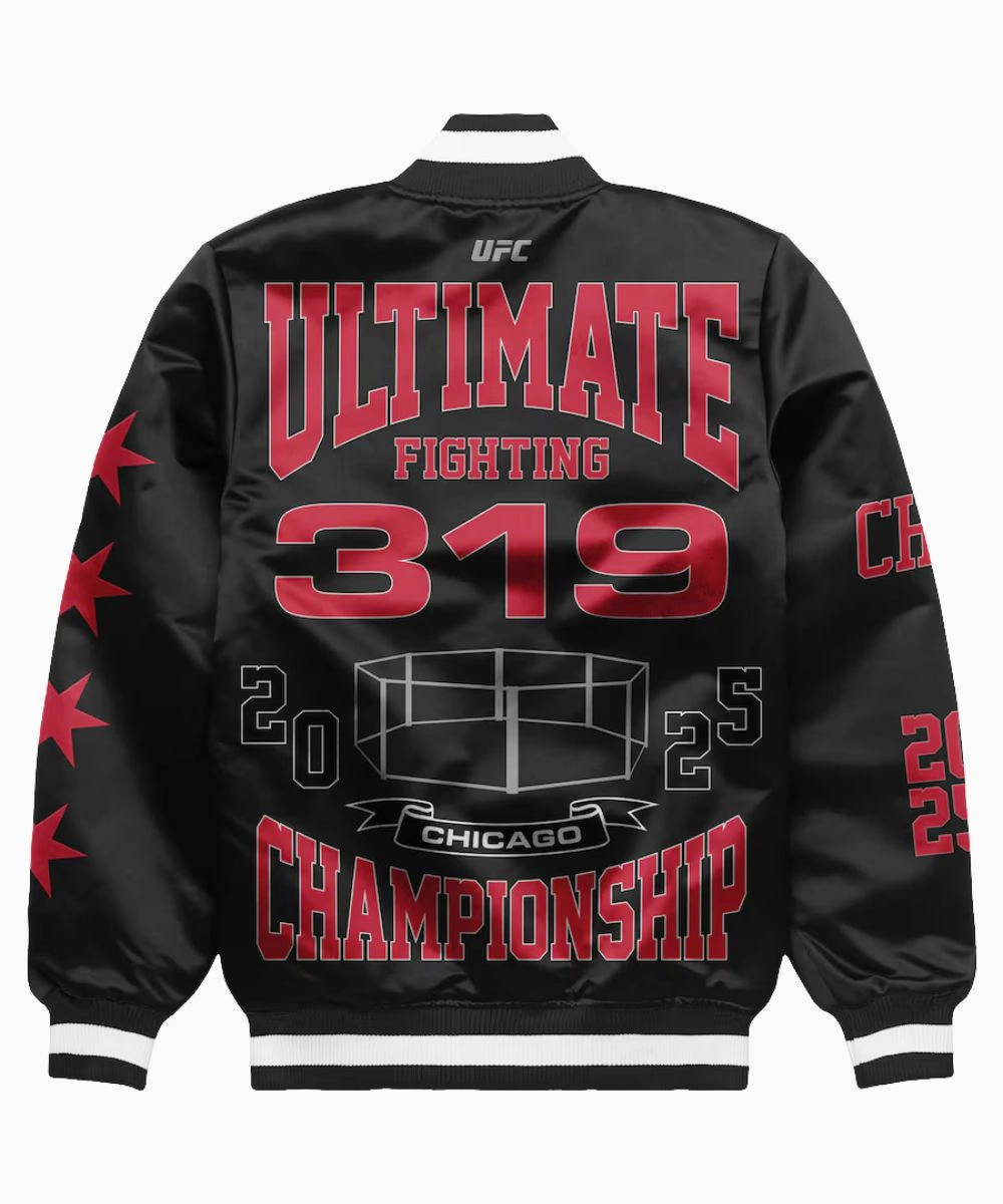 The back features striking red and black lettering that makes a bold statement– oversized ‘Ultimate Fighting Championship 319’ and Chicago details with star accents. The jacket is lightweight for mild weather yet great for layering over hoodies and tees. Shop (Ultimate Fighting Championship) UFC 319 Windy City Chicago 2025 Black Satin Varsity Jacket – Unisex to channel UFC 319 electric energy without compromising on comfort. The design is incredibly versatile and makes a statement everywhere you go. Full-length sleeves showcase red star motifs and Chicago and 2025 lettering. Rib-knit collar and cuff ensure structure and warmth intact, while two external pockets and two interior pockets offer storage for everyday essentials.