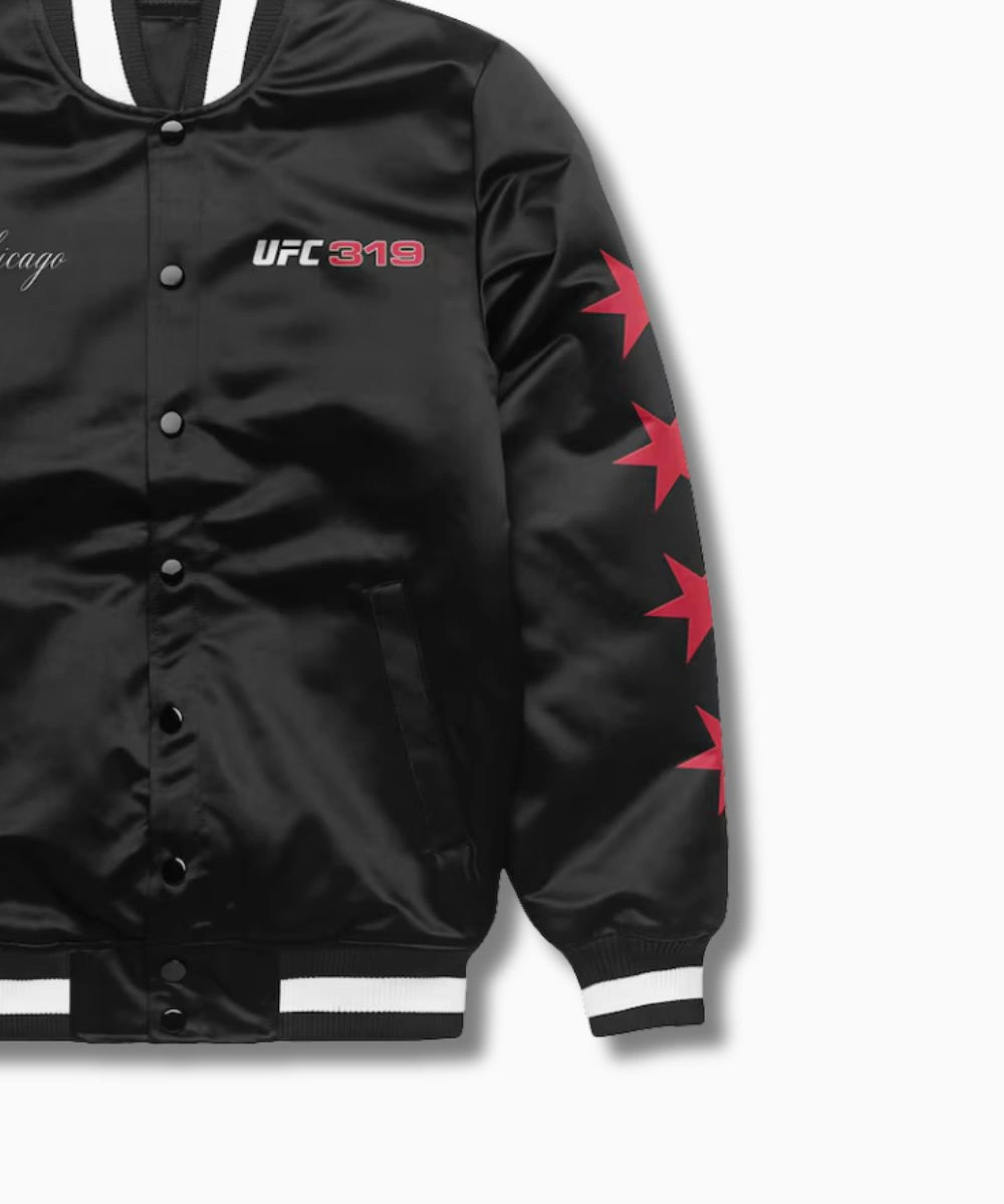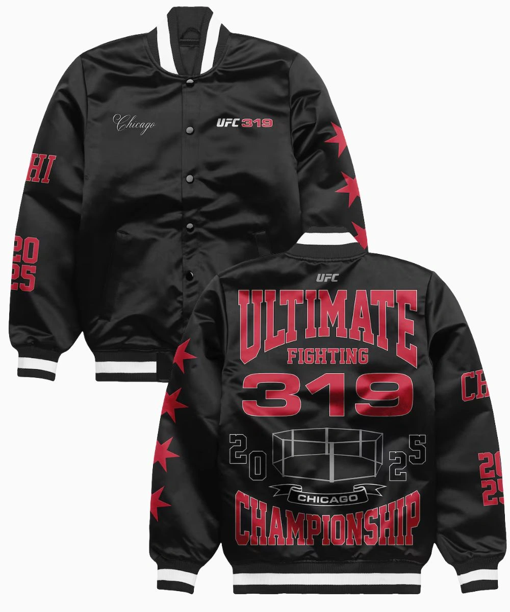 Introducing the UFC 319 Windy City Chicago Varsity Jacket—an athletic layer inspired by fight-night energy and bold varsity style. Crafted from high-quality satin, it showcases Chicago pride with UFC 319 branding across the chest. Rich satin finish is layered with soft lining for comforting warmth and a refined look. It features a striped ribbed collar and crisp button closure to balance structure and flexibility. (Ultimate Fighting Championship) UFC 319 Windy City Chicago 2025 Black Satin Varsity Jacket – Unisex is a timeless varsity package, great for layering or showing your fight-night pride in everyday life. It merges durable materials and clean lines, making it a smart pick for fans and fashion enthusiasts alike.