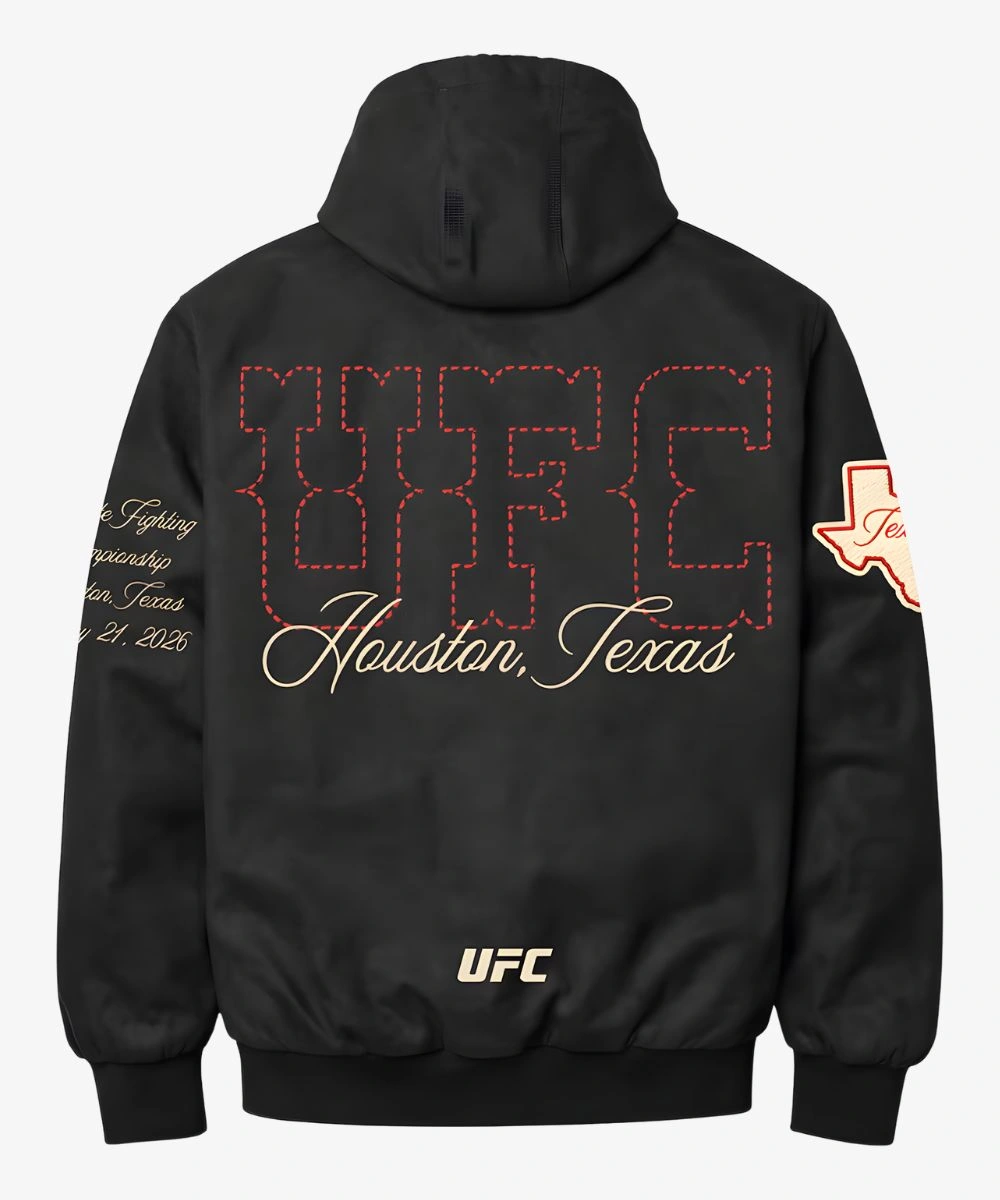 High contrast graphics are placed throughout the front, back and sleeves against deep black canvas. It celebrates the explosive energy of the Houston UFC event with bold branding. Design includes a smooth zipper closure and a generous hooded collar with drawstrings that provide maximum protection. The rib knitted cuffs and hemline give you a snug and sporty fit that retains its shape. The functional storage is implemented through a signature split kangaroo pocket. It is perfect for easy-access essentials without compromising its streamlined silhouette. Whether you are hitting the gym or navigating the city, its versatile design offers a “refreshed” take on traditional workwear, prioritizing a heavy-duty build that honours the resilience of world-class fighters.