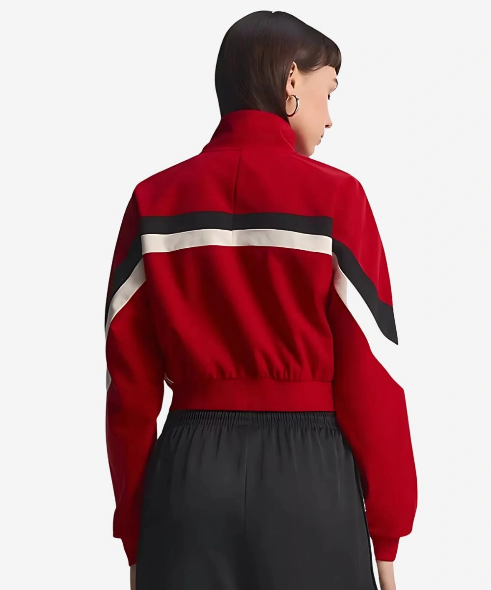 The Adidas Blocking Cropped Track Jacket For Women’s hugs the body with a soft fabric feel, while rib knit cuffs and hem blend function and fashion with ease. The long sleeves feature a black and white geometric pattern with the lower section in red. Whether you’re layering it over for a post-workout look or an urban look, this adidas jacket makes a bold impression everywhere.