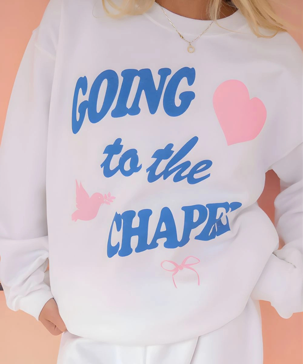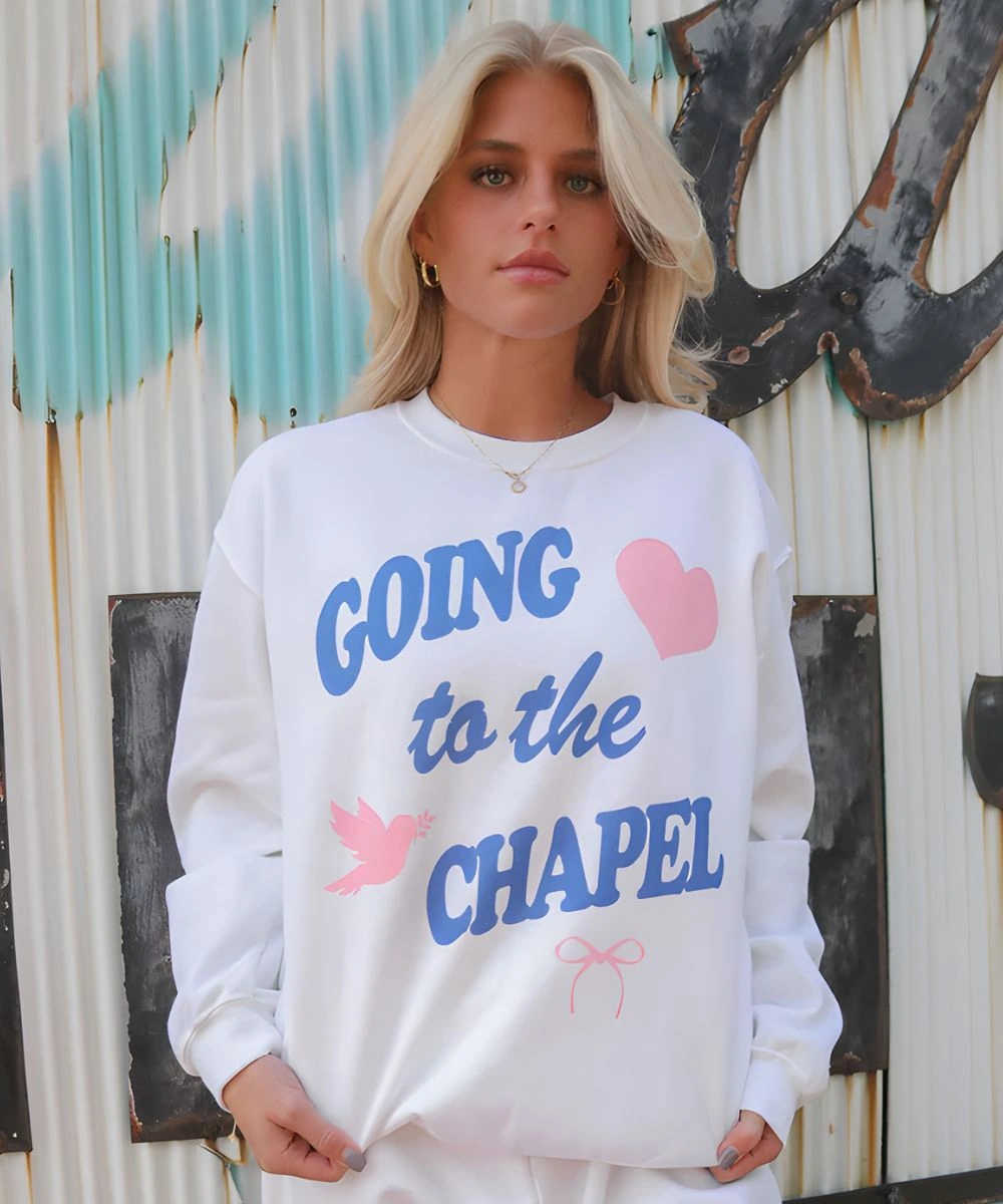 The design is centred on the “Going to the Chapel” graphic in a stylized and modern format that highlights visual identity. It has a classic round neck collar that sits flat for a clean, non-restrictive neckline, whilst the pullover closure adds to its effortless grab-and-go utility. The rib knitted cuffs are designed to ensure a fitted, tapered fit around the wrists to trap warmth and ensure a tailored silhouette. The fabric has a soft, broken-in feel that new pieces don’t always have and delivers instant comfort. Its versatility makes this Going to the Chapel Sweatshirt a great outer layer for pre-wedding-day celebrations or work as cozy lounge wear, carrying an evergreen message that expresses faith in the beauty of the commitment.Â